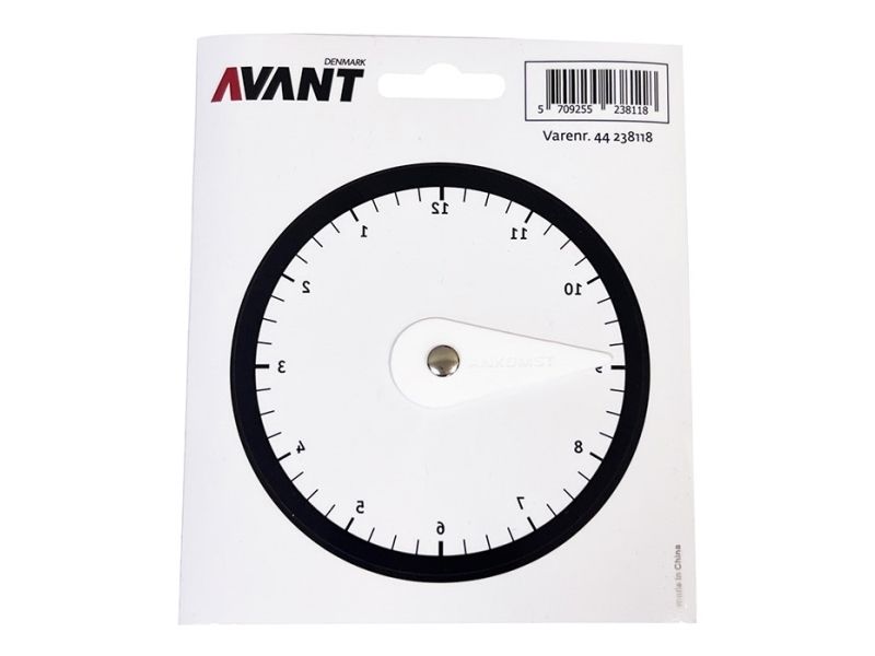 Skiven har sort ramme, sorte tal og hvid drejbar pil.