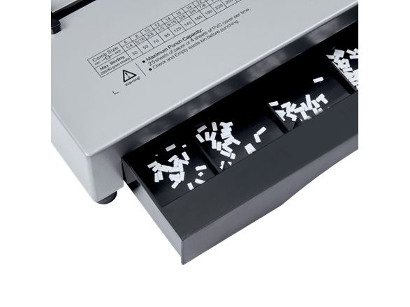 CombBind® CB25 Pro er en pålideligt og kraftig manuel Comb indbindingsmaskine, der er udviklet til at effektivisere dine daglige opgaver på kontoret, i hjemmet og i skolen. Justerbare pin-vælger muliggør ubesværet tilpasning til papirstørrelser op til A4, med fleksibilitet til at tilpasse margindybden. Den er designet til at være nem at bruge og har en praktisk udstansningsbakke for hurtig adgang. Denne robuste A4 indbindingsmaskine, der kan hulle op til 25 A4-ark (70 g), kan indbinde op til 500 ark ad gangen med 51 mm ryg, hvilket gør det til et ideelt valg til effektiv dokumentorganisering. Sølvfarvet. - Indbinder op til 500 (70g) ark ad gangen ved hjælp af en 51 mm Comb-ryg. - Huller op til 25 ark ad gangen (70 g) - Indbinder A4/A5 højformat og A3 højformat dokumenter. - Manuel hulning med dobbelt håndtag - 21 pin udstandsningsvælger til justering og tilpasning til alle papirstørrelser op til A4. - Justerbar margindybde - Vandret isætning - Let tilgængelig udstandsningsbakke med stor volumen - Kompatibel med Comb-rygstørrelser fra 6 mm til 51 mm - Skridsikre gummifødder - Kraftigt metalhus og kompakt design