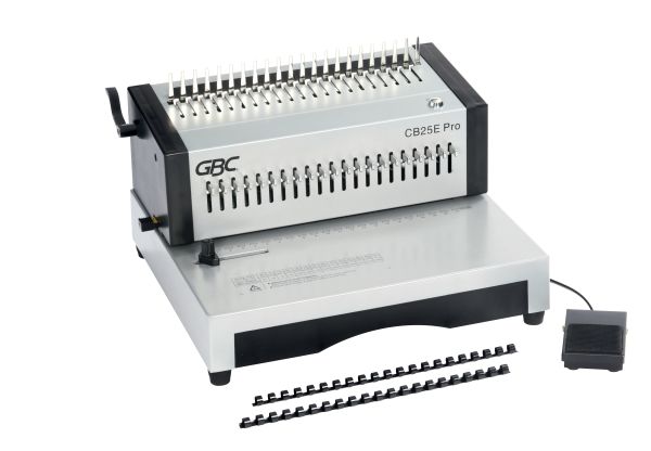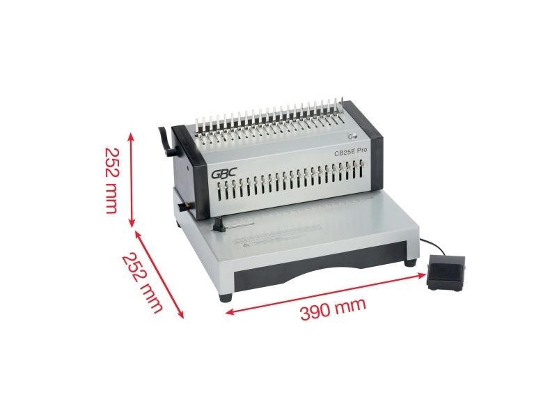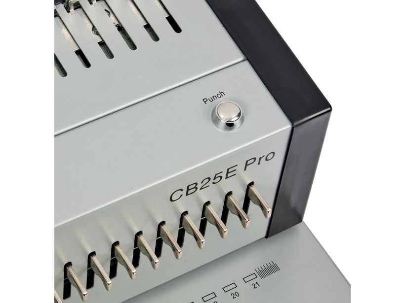 CombBind® CB25E Pro er en holdbar elektrisk indbindingsmaskine, der er designet til at klare opgaver på kontoret, i hjemmet og i skolen med moderate krav til brug. Justerbare pin-vælger muliggør ubesværet tilpasning til papirstørrelser op til A4, med fleksibilitet til at tilpasse margindybden. Den er designet til at være nem at bruge og har en praktisk udstansningsbakke for hurtig adgang. Med mulighed for at hulle op til 25 x A4-ark (70 g) kan denne pålidelige indbindingsmaskine effektivt indbinde op til 500 ark ad gangen ved hjælp af 51 mm rygge. Sølvfarvet. - Indbinder op til 500 (70g) ark ad gangen ved hjælp af en 51 mm Comb-ryg. - Huller op til 25 ark ad gangen (70 g) - Indbinder A4/A5 højformat og A3 højformat dokumenter. - Elektrisk hulning med fodpedal - 21 pin udstandsningsvælger til justering og tilpasning til alle papirstørrelser op til A4. - Justerbar margindybde - Vandret isætning - Let tilgængelig udstandsningsbakke med stor volumen - Kompatibel med Comb-rygstørrelser fra 6 mm til 51 mm - Skridsikre gummifødder - Kraftigt metalhus og kompakt design