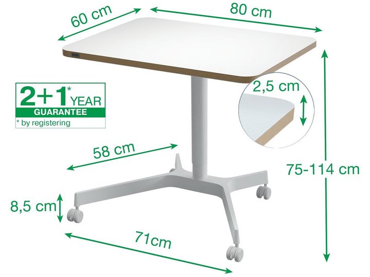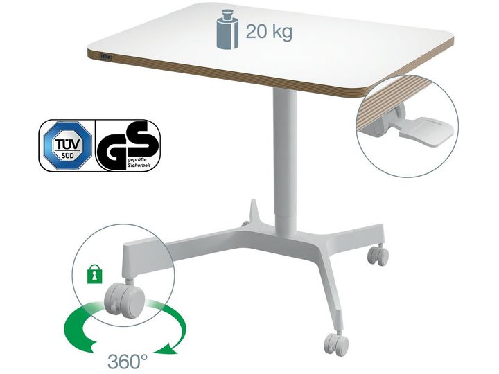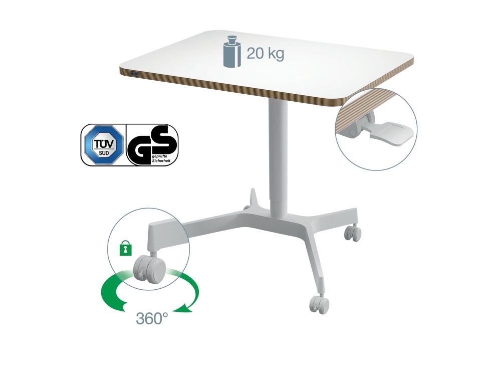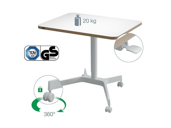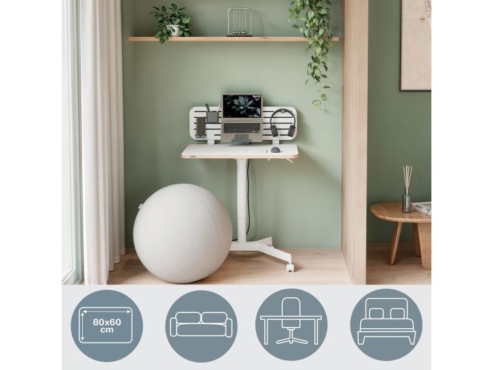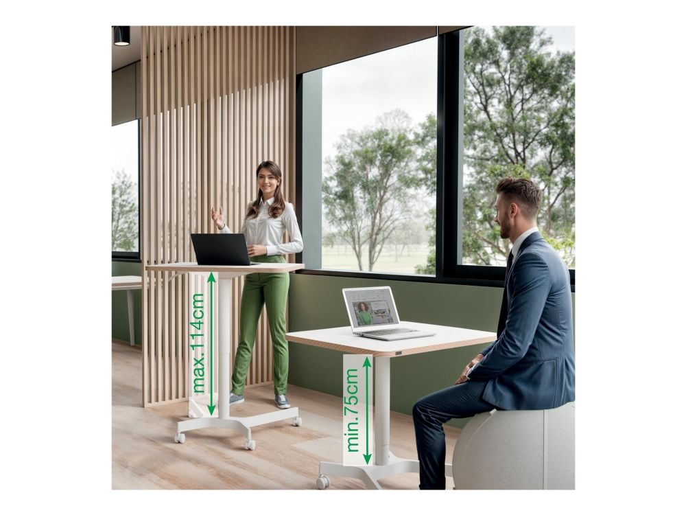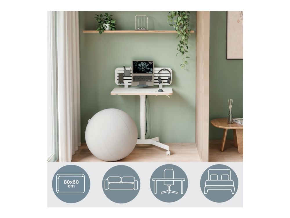 Leitz Ergo Small sittende/stående skrivebord er designet for å løfte ethvert møterom med sin moderne, minimalistiske stil. Skrivebordet har et robust, X-formet understell som gir stabilitet og mobilitet med låsbare hjul, slik at det enkelt kan flyttes ved behov. Skrivebordet tåler en maksimal belastning på 20 kg og har pneumatisk høydejustering for brukervennlighet, noe som gir en sømløs overgang mellom sittende og stående stilling. Med en rektangulær bordplate som måler 80 cm i bredden og 60 cm i dybden, har dette skrivebordet den perfekte størrelsen for samarbeidende arbeidsområder. Overholdelse av TUV-, GS- og FSC-standarder sikrer et pålitelig og miljøvennlig valg for ethvert kontormiljø. Skrivebordet må monteres, noe som gjør det til et alternativ som kan tilpasses ulike behov i en profesjonell setting.