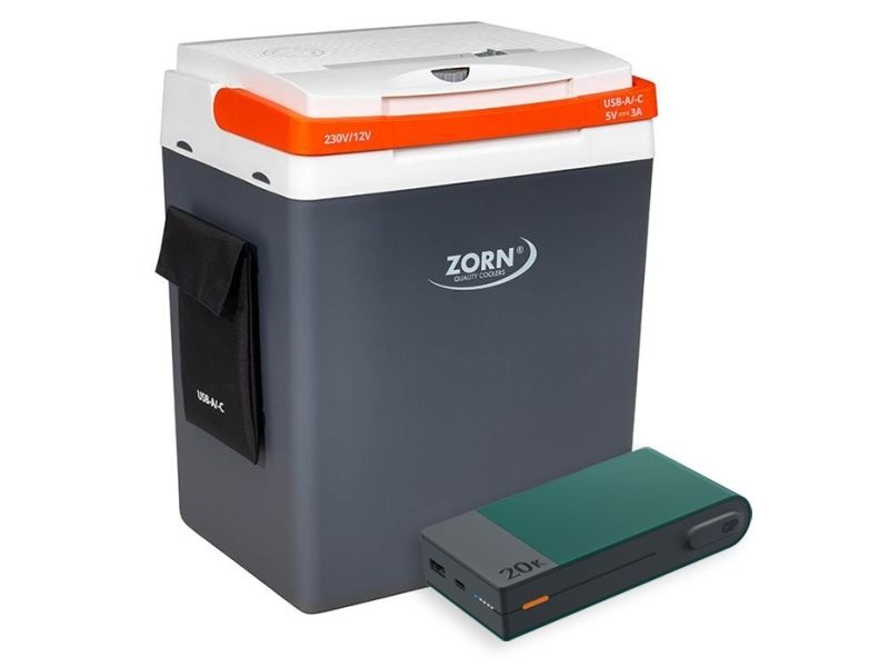ZORN 30 liters elektrisk køleboks 12/230V ink. 20.000 mAh powerbank ZORN Z32 elektrisk køleboks med en kapacitet på 30 liter og kan tilsluttes både 12 volt og 230 volt strømforsyning. Boksen har ligeledes USB-A/-C stik til tilslutning så du kan tilslutte den medfølgende 20.000 mAH GP powerbank og forlænger køletiden på din køletaske. Boksen kan holde en temperatur på op til 17°C under omgivelsestemperaturen. Den er udstyret med en termostat, der gør det muligt at justere temperaturen og energiforbruget ved 230V. Velegnet til 8x1,0 liter flasker (30,5 cm stående) eller 1x1,5 liter flasker (35 cm stående), 32x0,33 L drikkevaredåser.