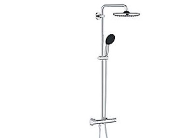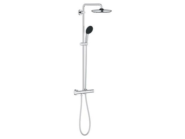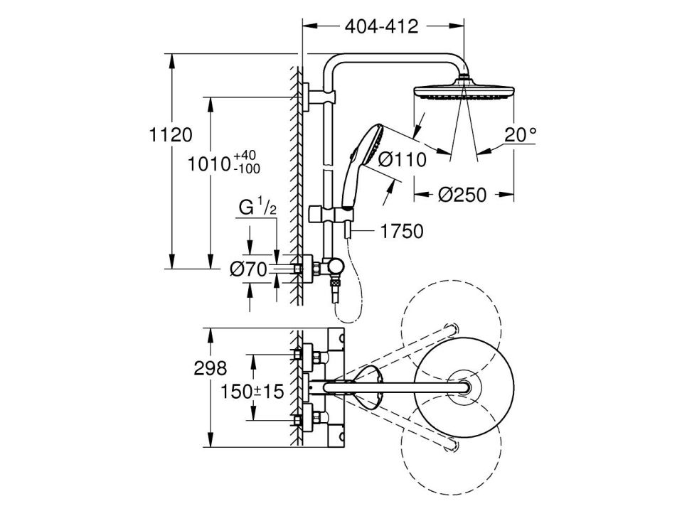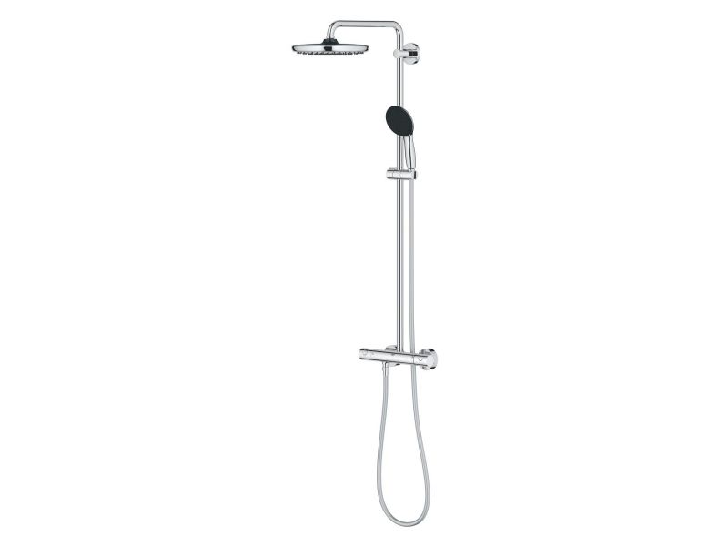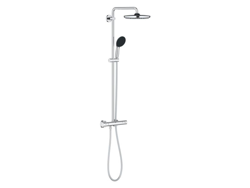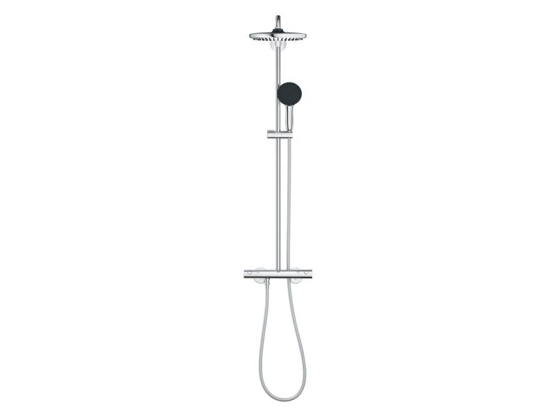 Vitalio Start System 250, Brusesystem med termostat til vægmontering, chrome, bestående af:vandret svingbar 390 mm brusearmøvre del af brusestangen kan justeres og tilpasses de eksisterende borede hullertermostat med Aquadimmer-funktionmuliggør skift mellem:head shower Vitalio Start 250stråletype:Rainmaksimal vandflow (ved 3 bar): 8 l/minHovedbruser med sort plademed kugleledKugleled ± 10°hand shower Vitalio Start 110 (27 946)2 stråletyper:Rain, Jetmaksimal vandflow (ved 3 bar): 8,3 l/minglideelementets højde er justerbartshower hose VitalioFlex Comfort 1750 mm 1/2'' x 1/2'' (28 745)Grohe TurboStat kompakt termostatelementGrohe Water Saving - reducerer vandforbruget og giver en perfekt gennemstrømningmed Grohe SafeStop ved 38° CGrohe SafeStop Plus valgfri temperaturbegrænser på 43°C inkluderetGrohe SmartSwitch - drej knappen for at skife til din foretrukne spray typeGrohe DreamSpray perfekt spraymønsterGrohe Long-Life-belægningGrohe MetalGrip ergonomisk formet metal håndtagSpeedClean antikalksystemIndvendig vandføring for længere levetidShockProof silikonering modvirker skader ved tab/fald af bruserTwistStop for at undgå snoede bruseslangerkan anvendes til gennemstrømsvarmer fra 18 kW/hmin. gennemløb 7 l/min.5 color packagingGrohe QuickSpanner included in chrome variant onlyConsumer edition