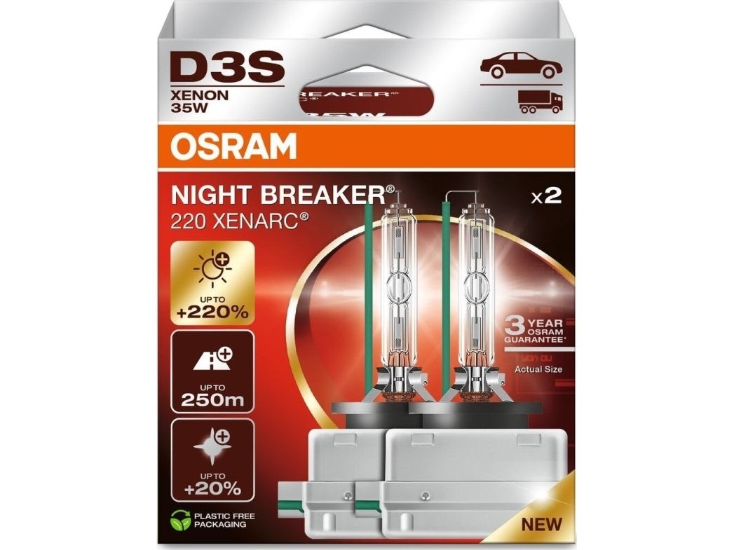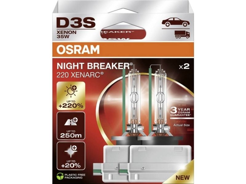 Osram Xenarc Night Breaker 220 D3S er den klareste xenon lys fra Osram. Denne kraftfulde lampe med effektiv xenon-teknologi sikrer en bedre synlighed på vejen med op til 220% mere lysstyrke sammenlignet med den mindste lovmæssige standard.
