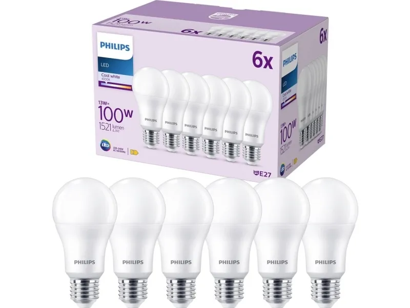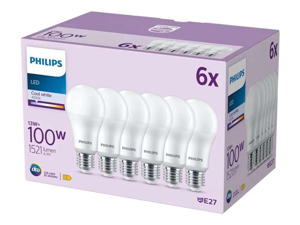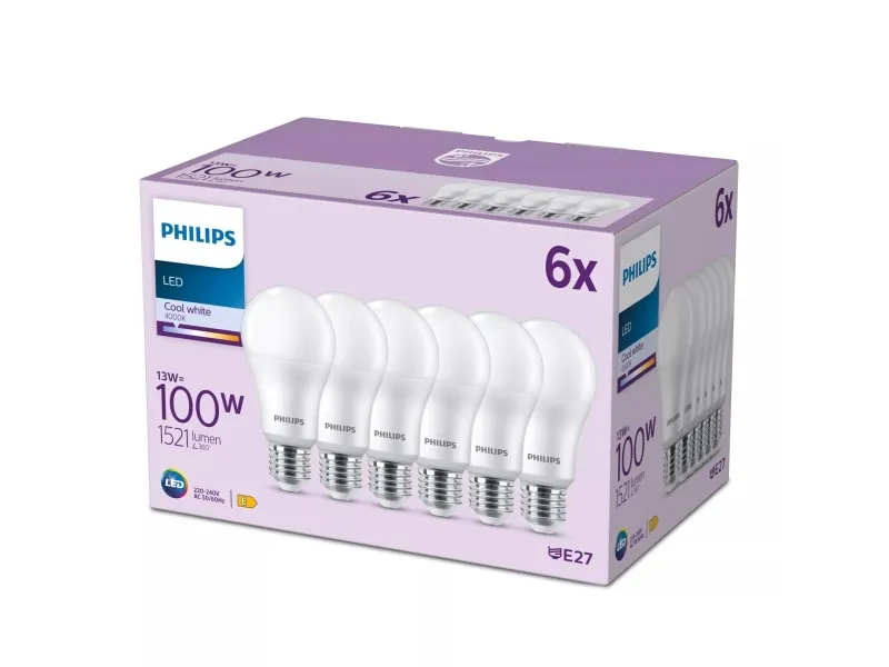 Philips - LED-lyspære - form: A67 - mattslipt finish - E27 - 13 W (ekvivalent 100 W) - klasse E - kjølilg hvitt lys - 4000 K (en pakke 6)