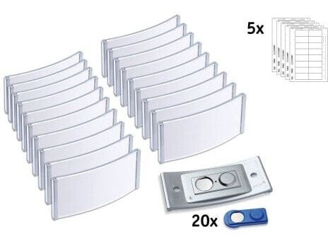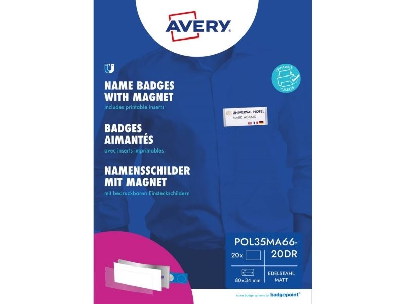 Navneskilt Badgepoint® 80x34 mm, Polar® Classic 35 Medarbejderskiltesæt, skilte med rustfri stålramme, akrylglas og printbare indstik - 20 skilte inkl. 80 indstik