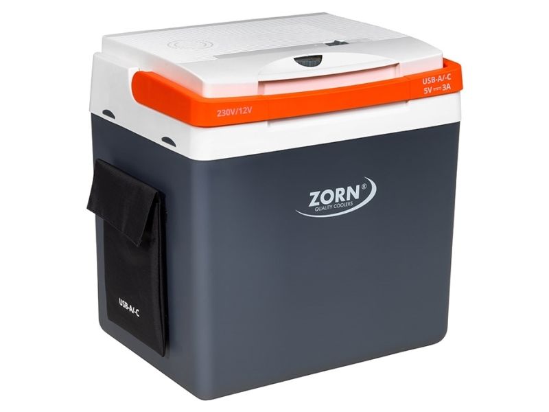 ZORN 25 liters elektrisk køleboks 12/230V og USB til powerbank tilslutning ZORN Z26 elektrisk køleboks og varmeboks med en kapacitet på 25 liter og kan tilsluttes både 12 volt og 230 volt strømforsyning. Boksen har ligeledes USB-A/-C stik til tilslutning af fx en powerbank for at forlænger køletiden på din køletaske. Boksen kan holde en temperatur på op til 17°C under omgivelsestemperaturen. Den er udstyret med en termostat, der gør det muligt at justere temperaturen og energiforbruget ved 230V. Forlæng køletiden på din køleboks med op til 10 timer med en USB-A/-c forbindelse til en mobil strømforsyning med kapacitet på 24.000 mAh fx en powerbank. (medfølger ikke) Velegnet til 8x1,0 liter flasker (30,5 cm stående) eller 1x1,5 liter flasker (35 cm stående), 32x0,33 L drikkevaredåser.