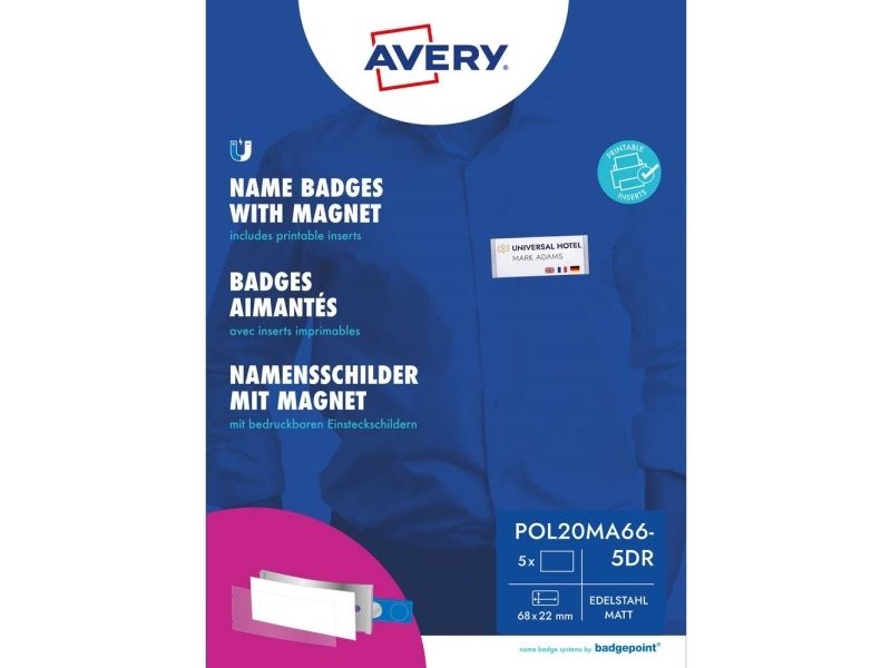 Kvalitet fra eksperten: Navneskiltene POL20MA66-5DR i formatet 68 x 22 mm fra Avery ZWECKFORM gør det muligt for dig at organisere arrangementer, seminarer og konferencer eller den perfekte optræden af personale fra alle brancher i kundekontakt. I det komplette sæt medfølger 5 navneskilte i førsteklasses optik af rustfrit stål (plast i høj kvalitet galvanisk metalliseret), passende trykkeark til markering af sig selv (din A4) og 5 Premium-monteringsklemagneter smag®.