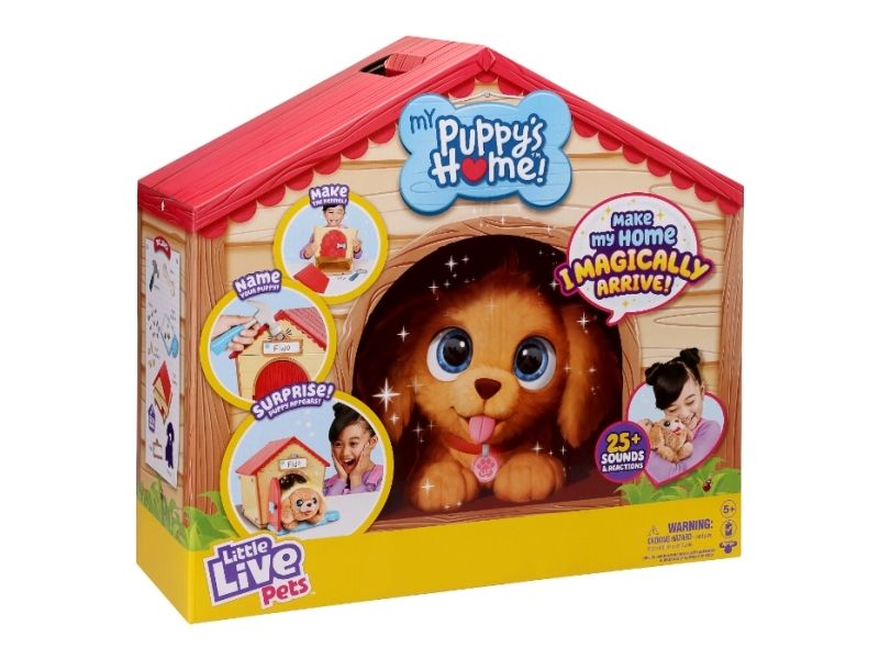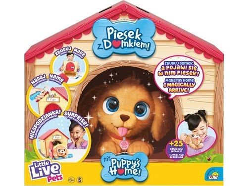 Little Live Pets - My Puppy's Home lar barn bygge et hus som gir den søteste overraskelsen i form av en bedårende kjæledyrsvalp! My Puppy's Home kommer som en flat pakke med alle verktøyene og delene barnet ditt trenger for å bygge en liten hjem for den søte nye hunden. Når veggene og taket er satt sammen, er det på tide å legge ut velkomstmatten og fylle valpens vannskål. Barn vil bli overrasket over å se søte små poteavtrykk vises på magisk vis på matten! Når barna legger til valpens navn til kennelen deres, er det på tide at den virkelige overraskelsen skjer. Åpne døren! En søt kjæledyrvalp har dukket opp fra ingensteds som barnet ditt kan forgude! Hvilken valp får de? Så interaktiv med mer enn 25 lyder og reaksjoner . Inkludert et leketøysbein. Barn kan gjenta den magiske ankomsten om og om igjen. Barn vil elske My Puppy's Home når de forbereder det perfekte hjemmet til den nye valpen. "1 x Puppy Home​​