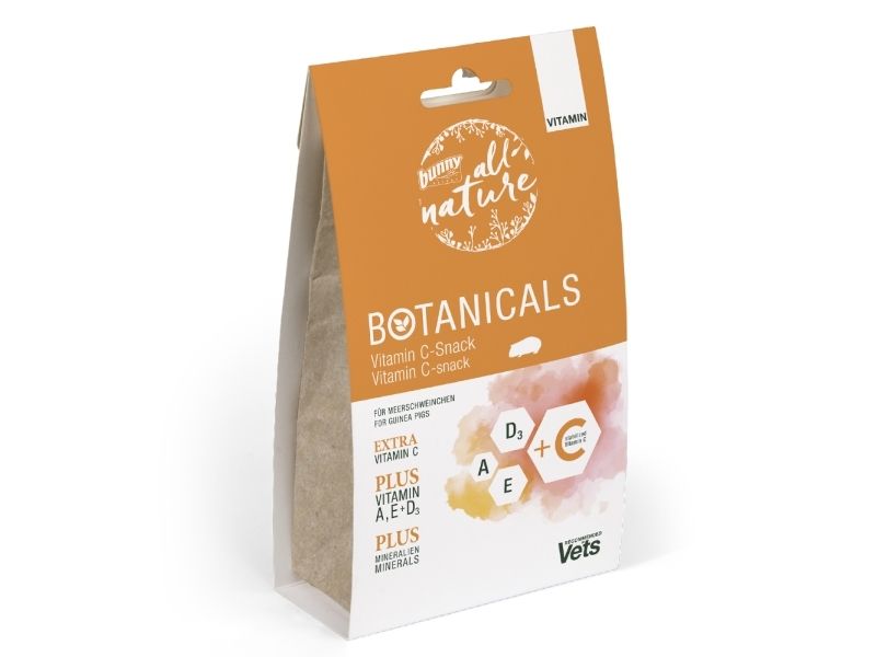 Botanicals Vitamin C-Snack sikrer, at marsvinene får alle nødvendige vitaminer og sporstoffer, især vitamin C. Denne snack udligner generelt vitaminsvingninger, da Moder Natur, afhængigt af vejret, kan forårsage variationer i vitamin- og næringsstofindholdet i alle plantekomponenter.