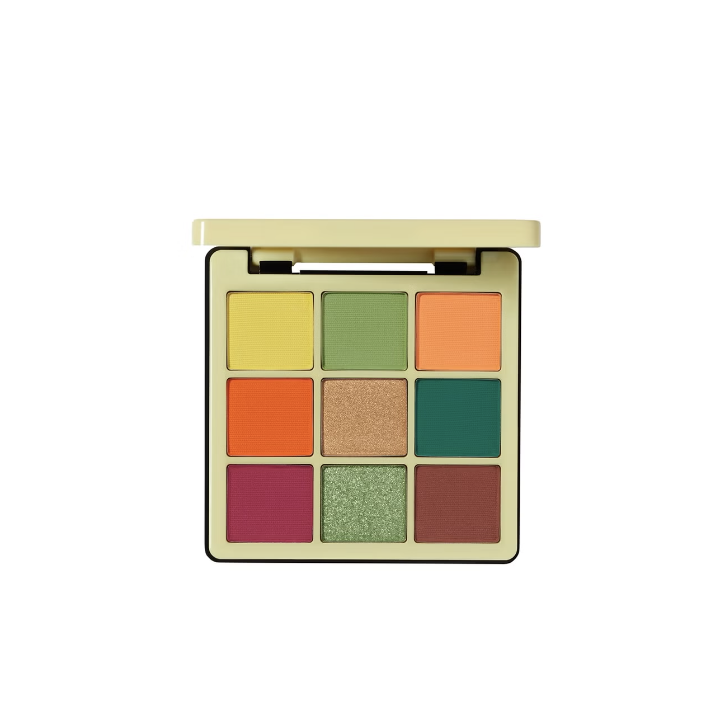 Denne 9-farvers øjenskyggepalette kombinerer levende statement-nuancer med bærbare jordtoner og multidimensionelle shimmer-effekter. Farveudvalget spænder fra limegul og salviegrøn til intens orange, petrol og dyb hindbær – perfekt til både kunstneriske looks og sofistikeret hverdagsglam.