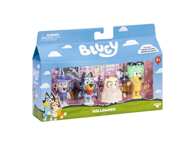 Bluey Figurer 4 pk., Halloween. Tag med Bluey, Bingo, Chloe og Lucky, når de går "Trick og Treat" til Halloween! Figursættet er fyldt med uhyggeligt kostumesjov! Bøh! Fra 3 år.