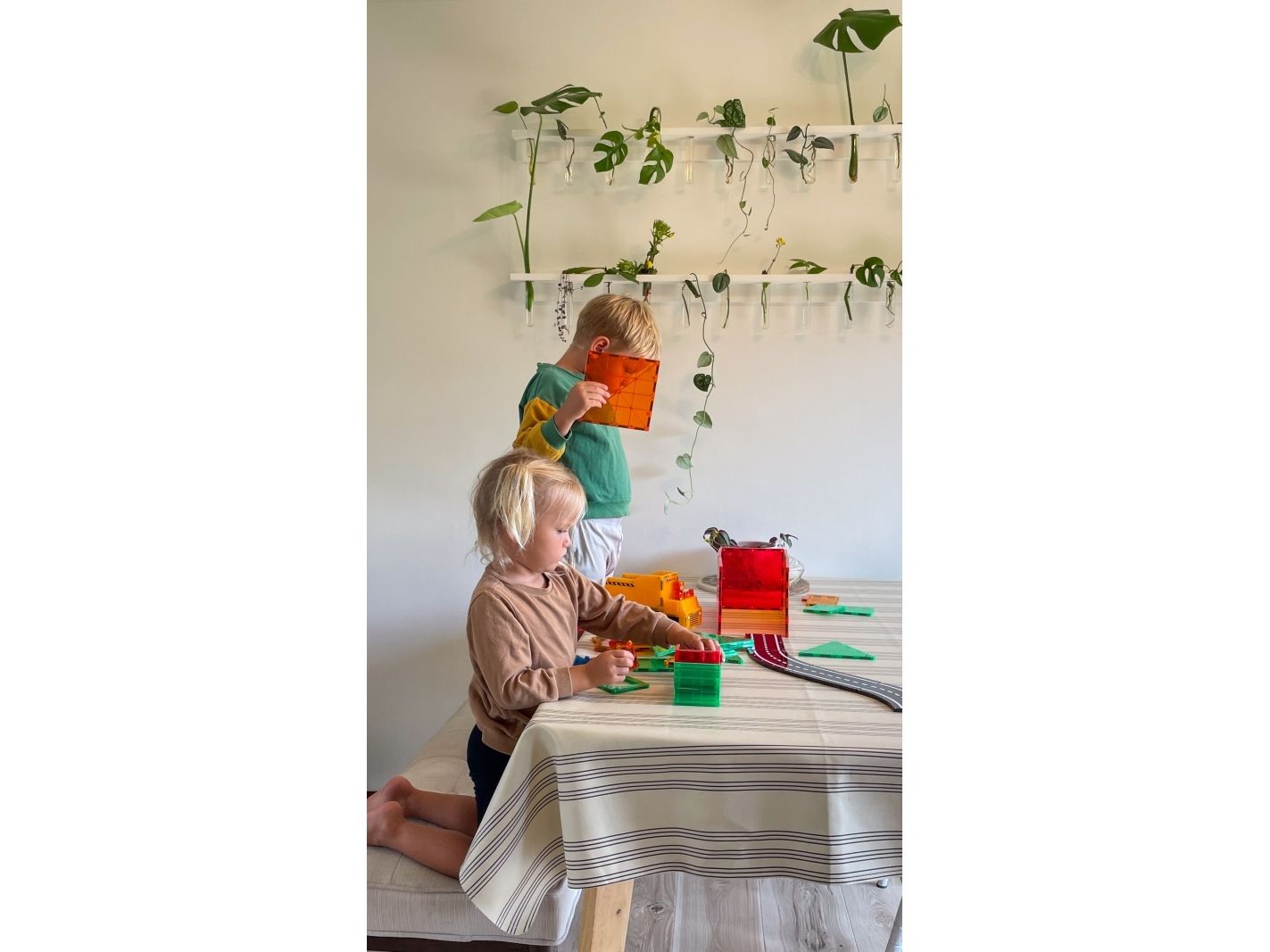 Eller du kan prøve at sætte de forskellige farver foran dit ene øje eller begge øjne og se hvordan rummet, en ting, en legekammerat eller naturen ser ud igennem de forskellige byggebrikkers farver – er der mon forskel på det, du ser igennem en gul, grøn el. rød farve?