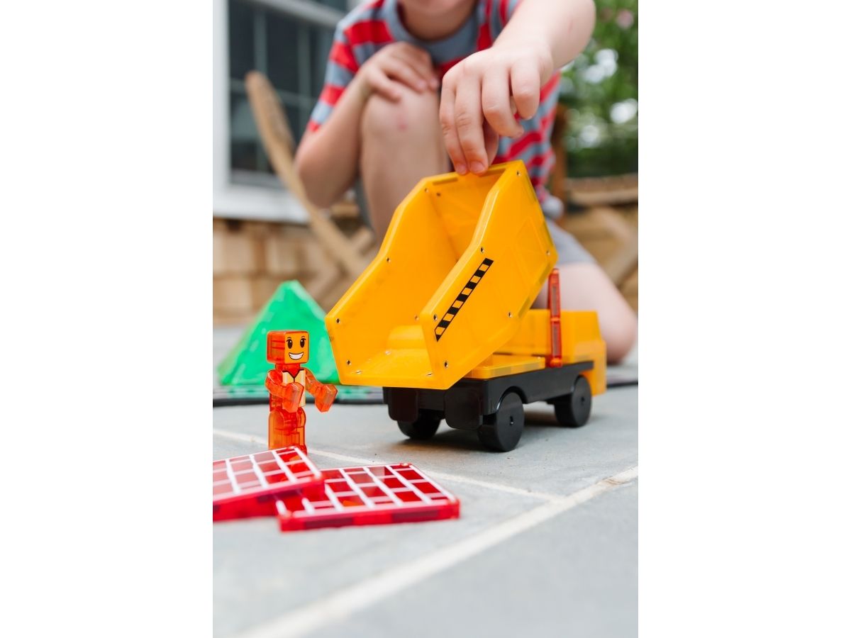 Hvad er inkluderet: 50 magnetiske dele, herunder: 1 kran + base, 1 tippelastbil bagklap + base, 1 plov, 2 lastbilkabiner, 2 figurer, 2 rektangulære veje, 2 buede veje, 2 rektangler (trykt), 2 bilchassis, 2 vinduer, 1 XL højre trekant, 4 XL ligesidede trekanter, 6 XL firkanter, 14 firkanter (4 trykte, 8 almindelige) og 6 microMAGS ligebenede trekanter.