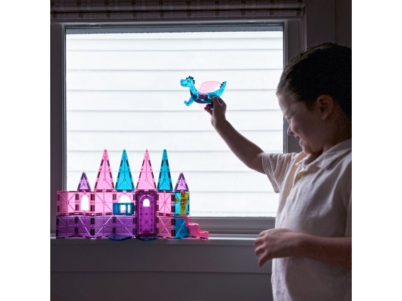 MAGNA-TILES Glitter-brikker vil glimte som i ethvert eventyr med slotte og drager.
