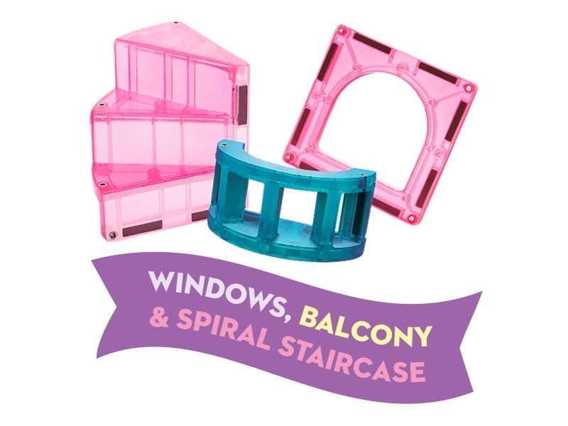 Indeholder MAGNA-TILES-vindebro, vinduer, en balkon og en spiraltrappe.