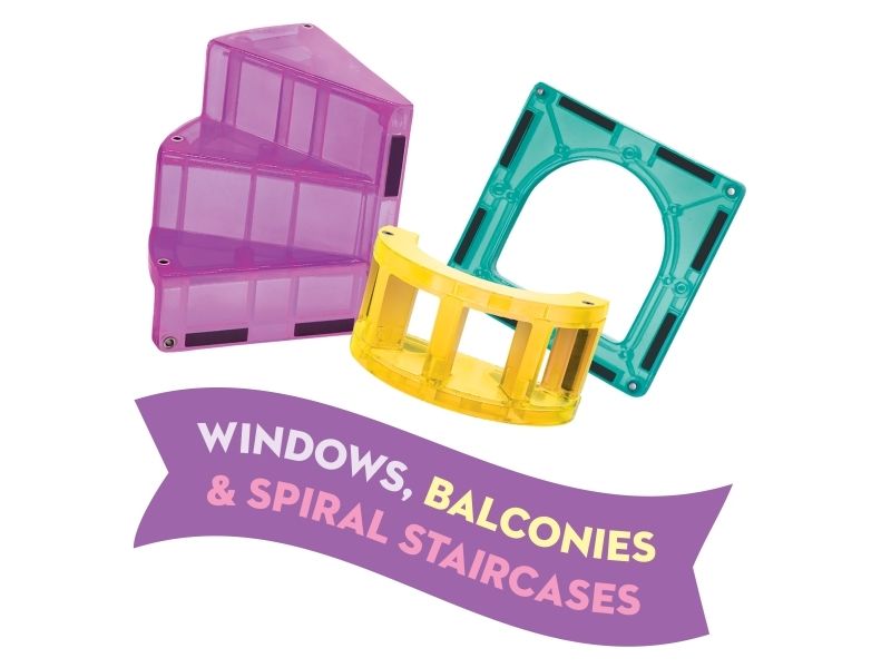 Slot DLX-sættet indeholder også MAGNA-TILES®’s første balkoner og spiraltrapper, samt microMAGS og masser af glitterbrikker for ekstra eventyrlig fortryllelse.