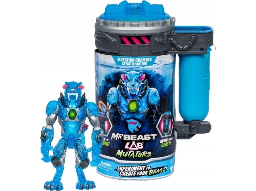 MrBeast Lab Mutator Stealth Panther! Udfør eksperimentet og skab en sej MrBeast-inspireret actionfigur! Den Snigende Panter Mutant er 13 cm høj og har over 20 bevægelsespunkter! 5+ år.