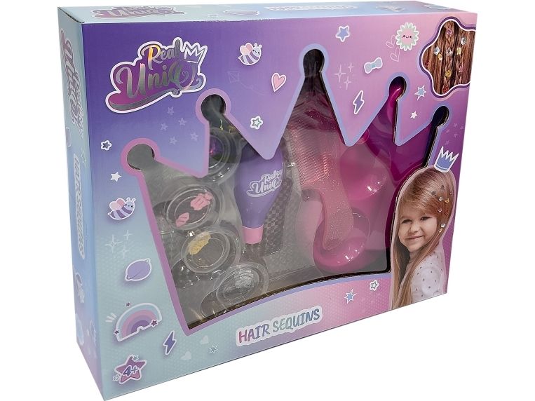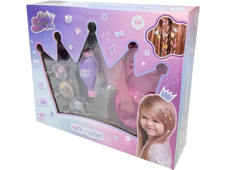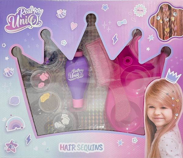 Real UniQ Hårpailletstation! Du kan nu dekorere og pynte dit hår med glimtende pailletter, så dit hår bliver helt unikt og vil passe til både fest og sjove dage. 6+år