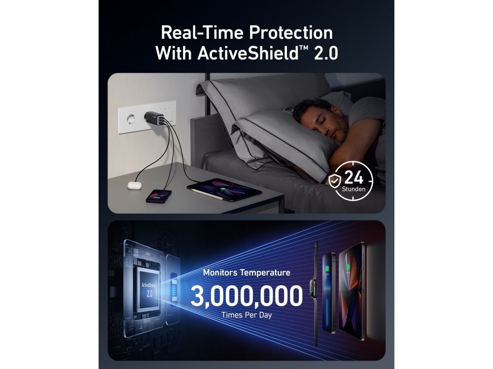 Anker A2148313. Charger type: Indoor, Power source type: AC, Charger compatibility: Universal. Input voltage: 100 - 240 V. USB 2.0 ports quantity: 1, USB Type-C ports quantity: 2, Power protection features: Over current, Over voltage, Short circuit. Product colour: Black