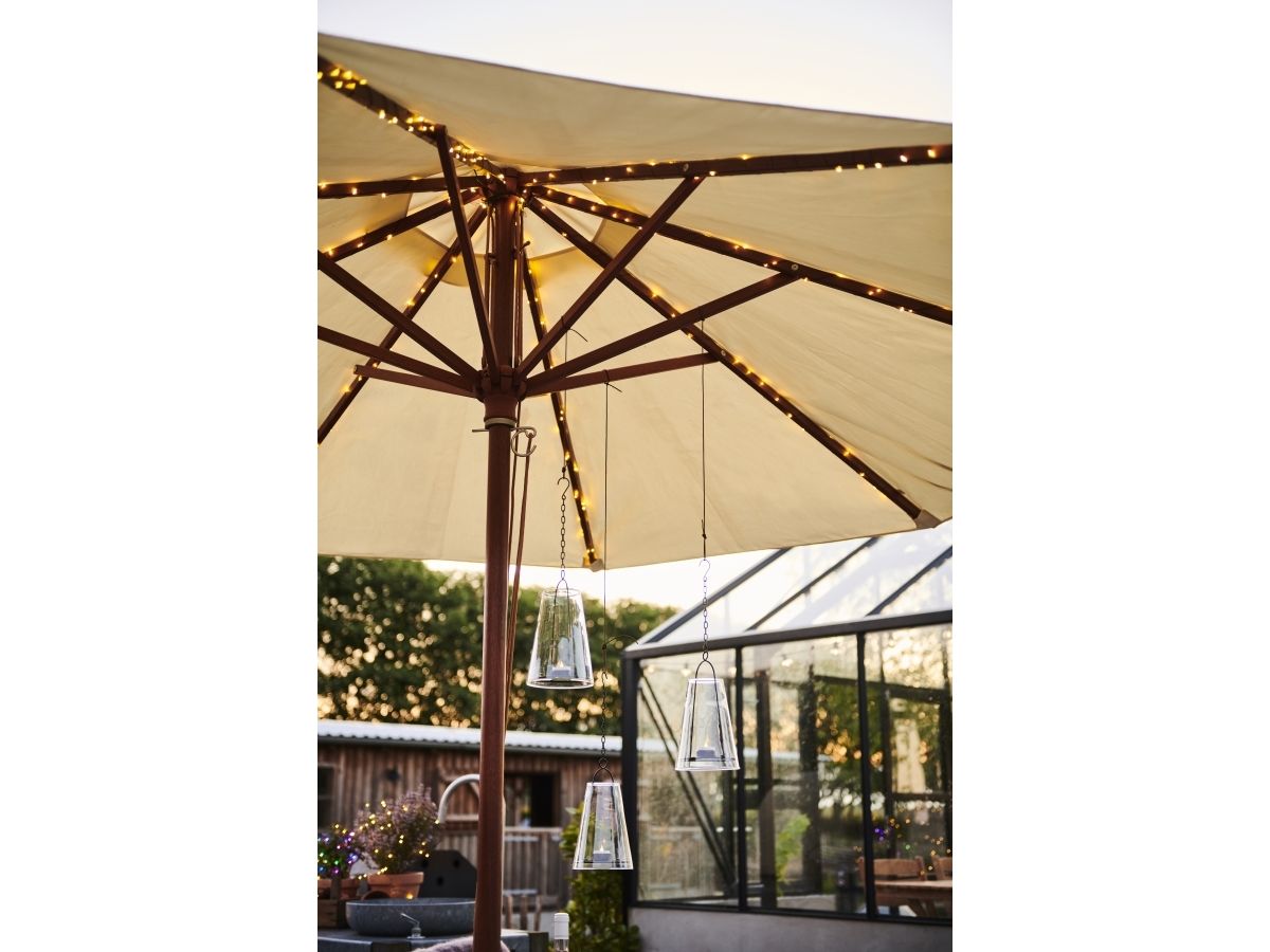 Skab bæredygtig hygge omkring havebordet i de sene sommeraftener med vores nye solcelle kæde til at sætte under din parasol.