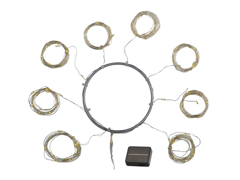 Knirke Solar parasolkæde er supernem at påsætte din parasol. Den nye solcelle kæde består af 8 kobberledninger med i alt 96 LED lys, der løber ud fra en kobberring. Hver ledning er 1,5 meter lang og skal snoges omkring armene på under parasoldugen. Har en forlængerledning til solcellen på 2 meter.