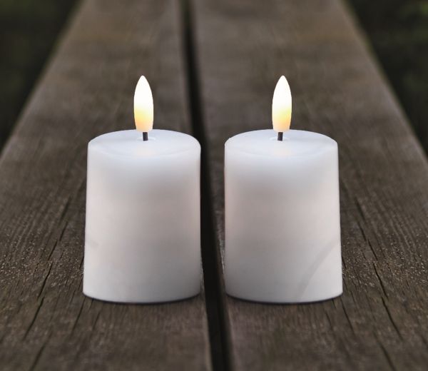 Lyset er lavet i plastik med en glat og vokslignende overflade. Flammen er ligesom i resten af vores Sille serie, skabt med et flimrende LED-lys og en væge, hvilket giver lyset et autentisk udtryk. Med de to små Sille Udendørs bloklys, har du altid et fint sæt af lys på hånden til dine særlige øjeblikke.