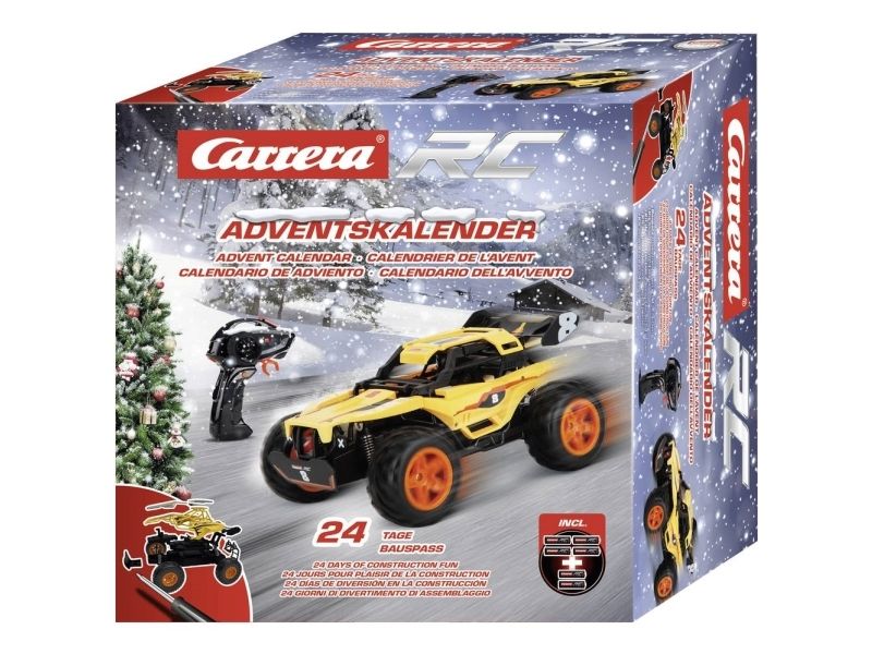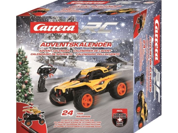 24 låge til action med action til Carrera RC Carrera RC julekalenderen er chauffører fra 12 år og tilbage deres racer ganske enkelt Bag kalenderens 24 låger gemmer alle nødvendige dele, controllere samt batterier sig. Vejledningen bliver også afsløret i dørform og på den måde opstår der trin for trin en fantastisk buggy, som flitter allerede før tømning i stuen. Den 23,5 cm lange buggy imponerer med op til 12 km/h top Speed og Full Function-styring. For at spare energi slukker køretøjet automatisk, når der ikke køres.