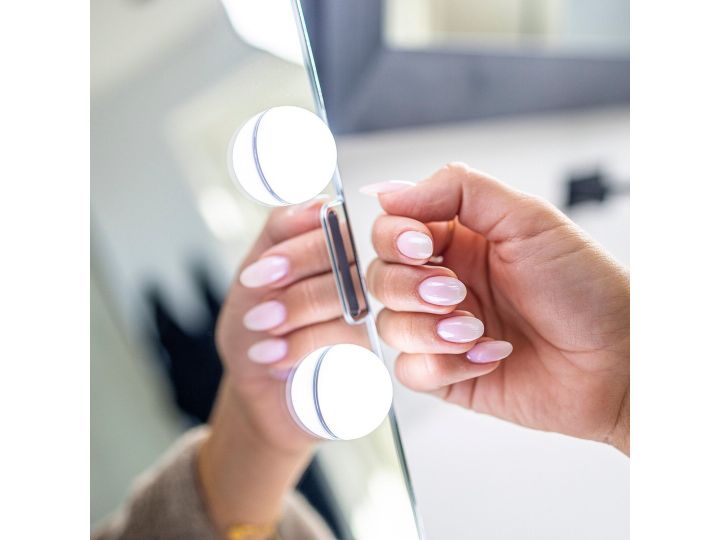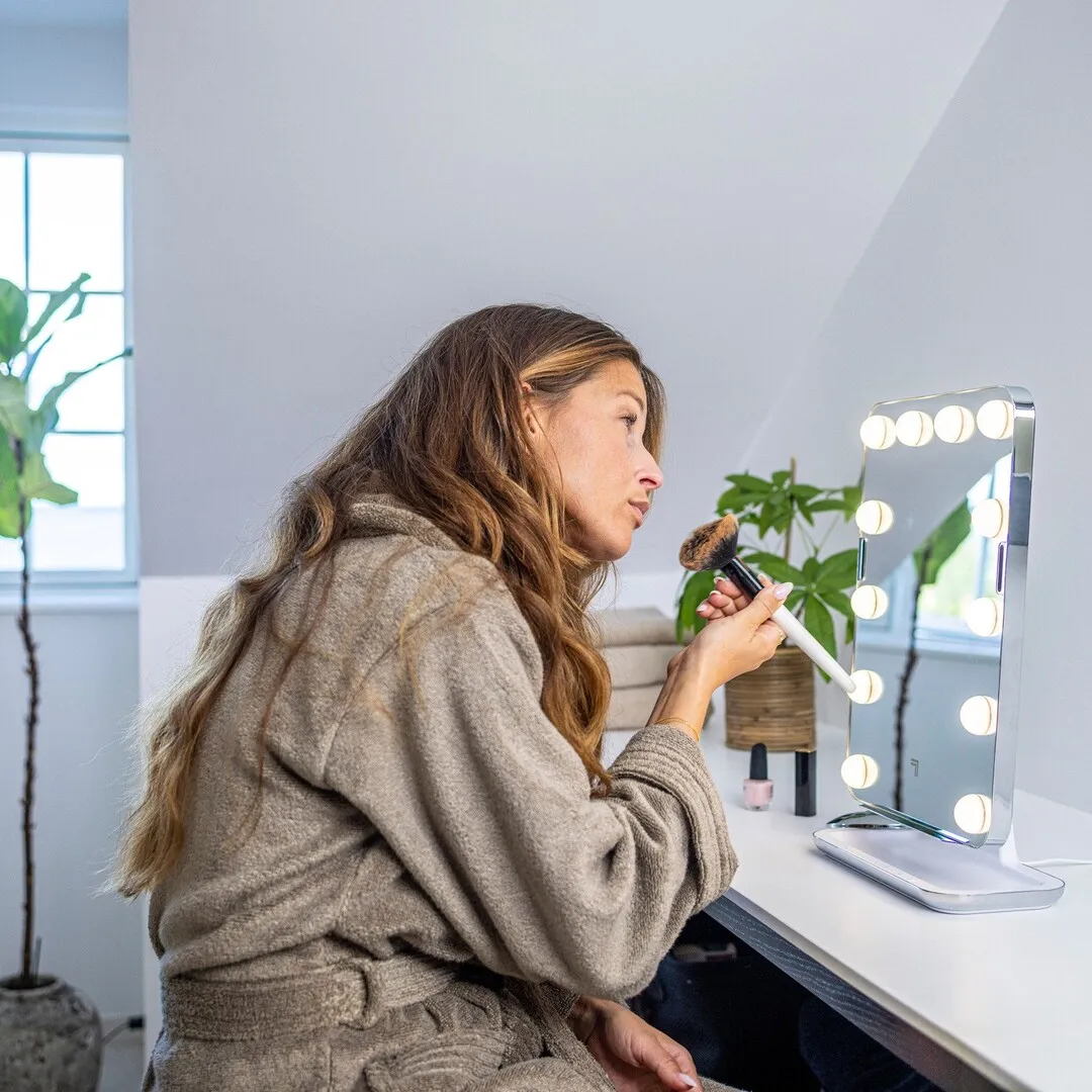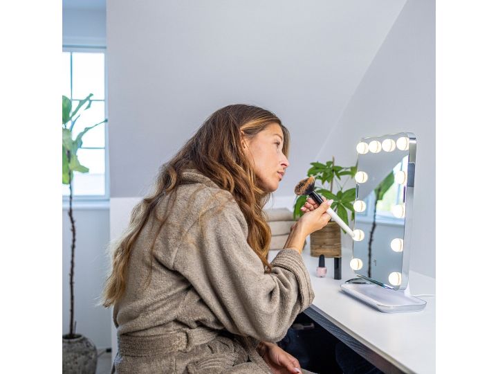 Det stilige og multifunksjonelle speilet er utstyrt med en avansert berøringskontrollert LED-belysning som lar deg justere lysstyrken og fargetemperaturen for å skape den ideelle atmosfæren. Med trådløs Qi-lading kan du holde enhetene drevet mens du sminker deg.