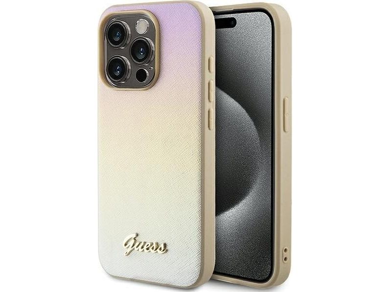 Guess Saffiano Iridescent Script etui til iPhone 14 Pro Max - gull