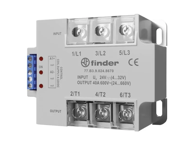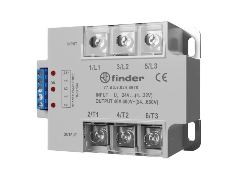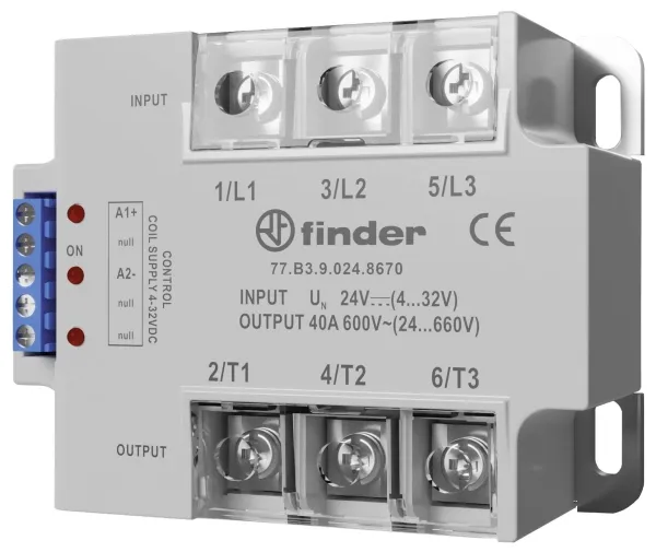 Elektronisk belastningsrelæ, 40 A 77.B3.9.024.8671 3-polet SSR-relæ Hockey puck-konstruktion Montering på el-skabs-plade eller på kølelegeme Lang levetid og koblingshastighed Lichtbogen- og prelfri kobling Lav styreeffekt