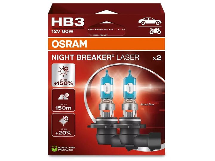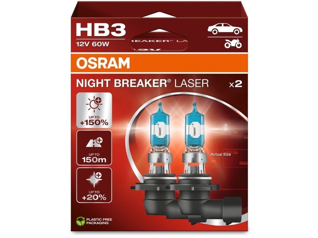 Osram Night Breaker Laser HB3 er en halogenforlygtepærer som lyser op til 150% kraftigere sammenlignet med den lovmæssige minimumsstandard. Det højkonstruerede filament sikrer et ekstra lysboost. Som følge heraf giver lamperne en op til 150 m lang lysstråle og op til 20% hvidere lys sammenlignet med den mindste lovmæssige standard.