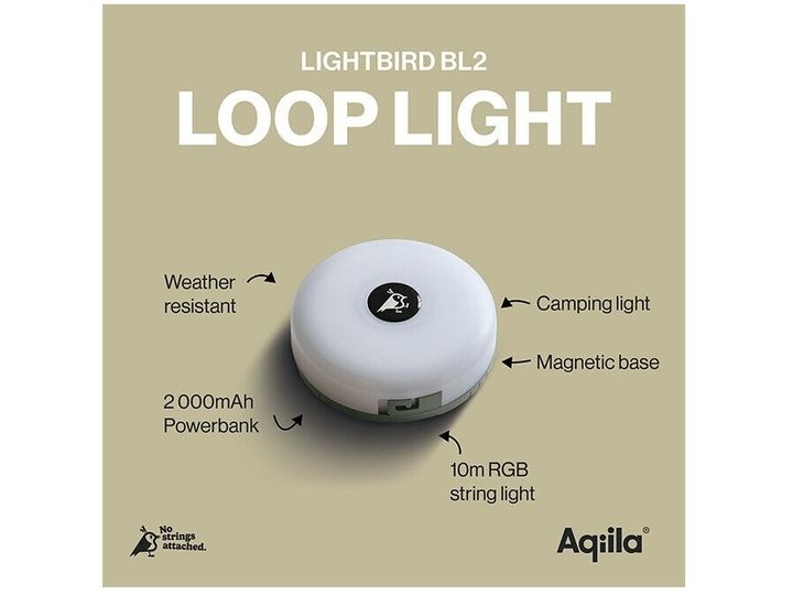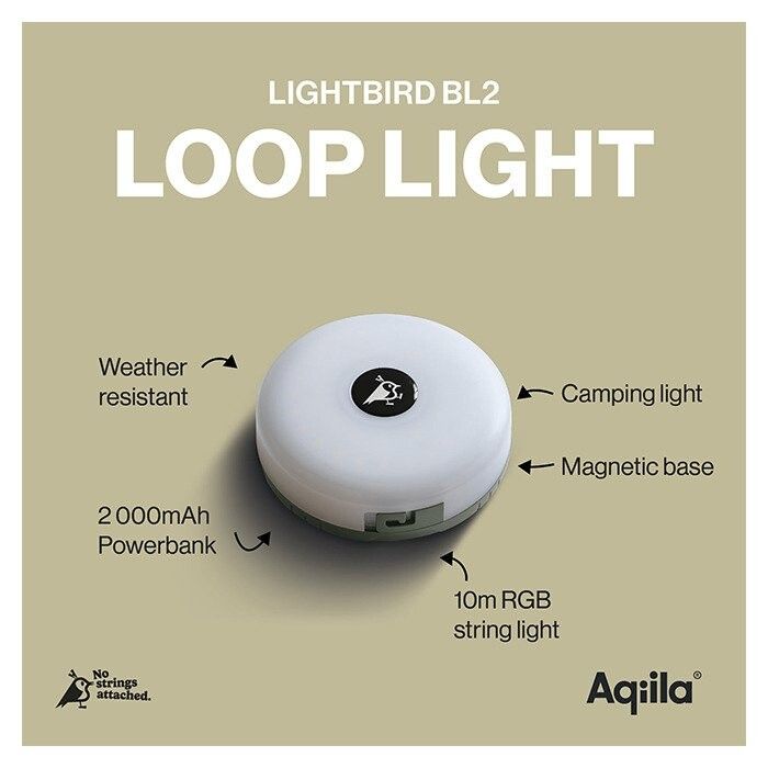 Aqiila Lightbird BL2 er en alsidig og stilfuld campinglampe, der kombinerer funktionalitet og stemningsskabende lys i ét smart design. Med op til 10 meter RGB-loop-lys og flere lystilstande kan du skabe den perfekte atmosfære – uanset om du er på camping, i haven eller til fest. Når du er færdig, trækkes LED-strengen nemt tilbage i lampens krop. Selve kroppen fungerer også som en kraftig lyskilde med op til 250 lumen og har indbygget lommelygte i bunden.