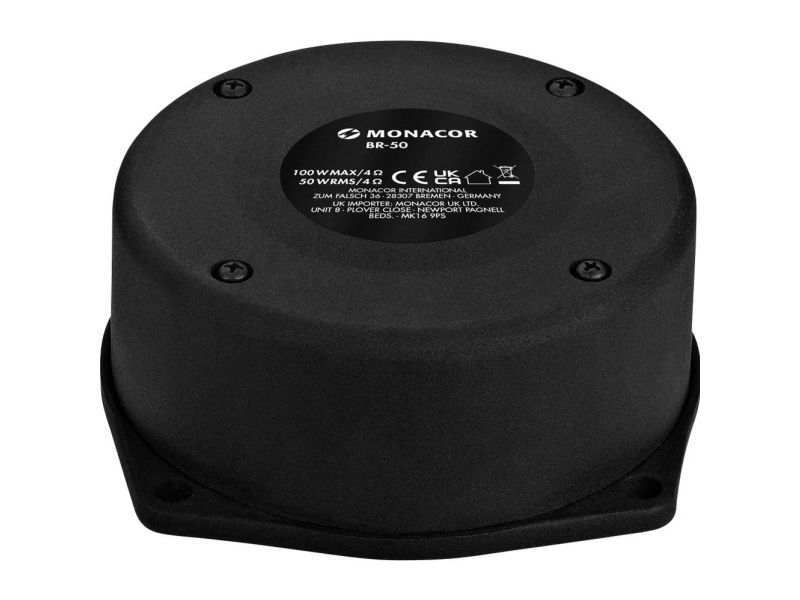 Special-teknologi til frembringelse af kroppen af montering på sæder eller også svingende stå- eller dansegulve skaber fysisk mærkbar bas, nem skruemontage-tilslutning til passende hovedforstærkere via enkle passive bløde såvel som til subwoofer eller endnu bedre via egen forstærker serie- og parallelkobling af flere BR-50 er som ved almindelige bashøjttalere muligt med resonansfrekvens på 40 Hz (varierer ved montering på forskellige flader) funktionsområde ca. 30-300 Hz nødvendig, plan monteringsflade mindst 110 x 110 mm mål 131 x 131 x 56 mm vægt 1,232 kg