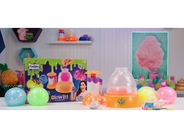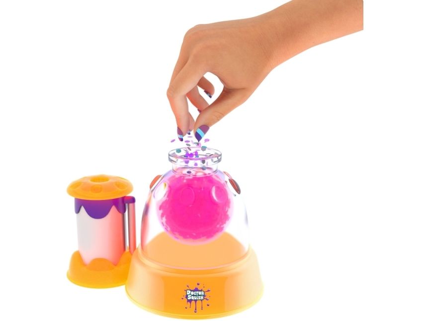 Doctor Squish elsker å finne de beste klemmelekene for å se hva som er inni! Hun elsker å lage sine egne klemmeballer og andre ting som kan klemmes på. Med Squishy-maskinen kan du nå også lage dine egne squishies som lyser i mørket. Bare tilsett dekorasjon og slimpulver og fyll deretter på med vann. Du kan velge å bruke det som følger med maskinen, men du kan også bruke din egen dekorasjon. Fra 8 år.