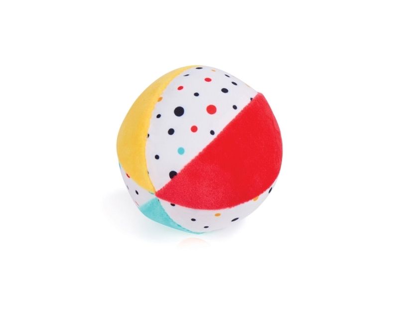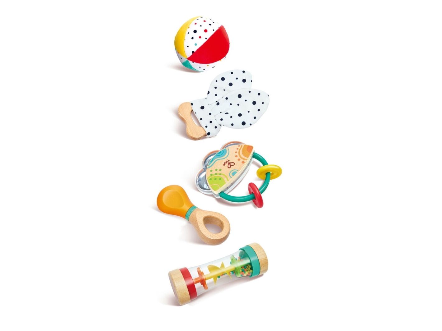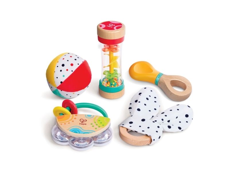 A 5-in-1 toy set with a tambourine, rattle, ball, ring, and rainmaker that helps develop babies` core skills.