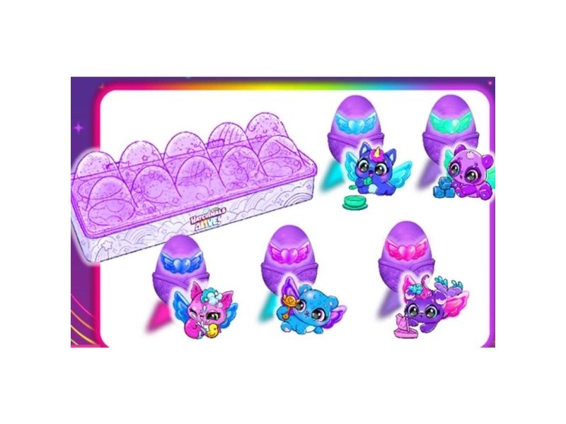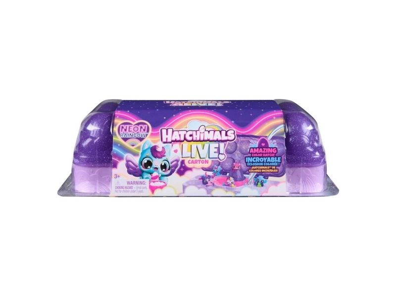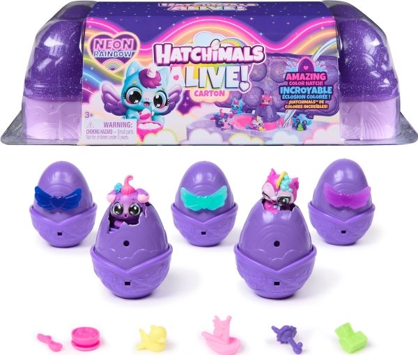 Includes: 5 Hatchimals CollEGGtibles, 1 Carton, 6 Nurturing Accessories, 5 Pairs of Wings, 1 Checklist, 1 Instruction SheetHatchimals Alive, Neon Rainbow Egg Carton Toy, Cute Easter Basket Stuffers, Includes 5 Collectible Figures in Color Reveal Eggs, 11 Accessories. Recommended age (min): 3 yr(s), Product colour: Multicolour