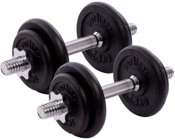 Brand- Outliner. Weight- 20 kg. Material- Plastic, Rubber, Steel, Cast iron. Colour- Black, Chrome. Contents- 2 x frets, 4 x locks, 4 x 2.5 kg, 4 x 1.25 kg. Number of Items- 8.
