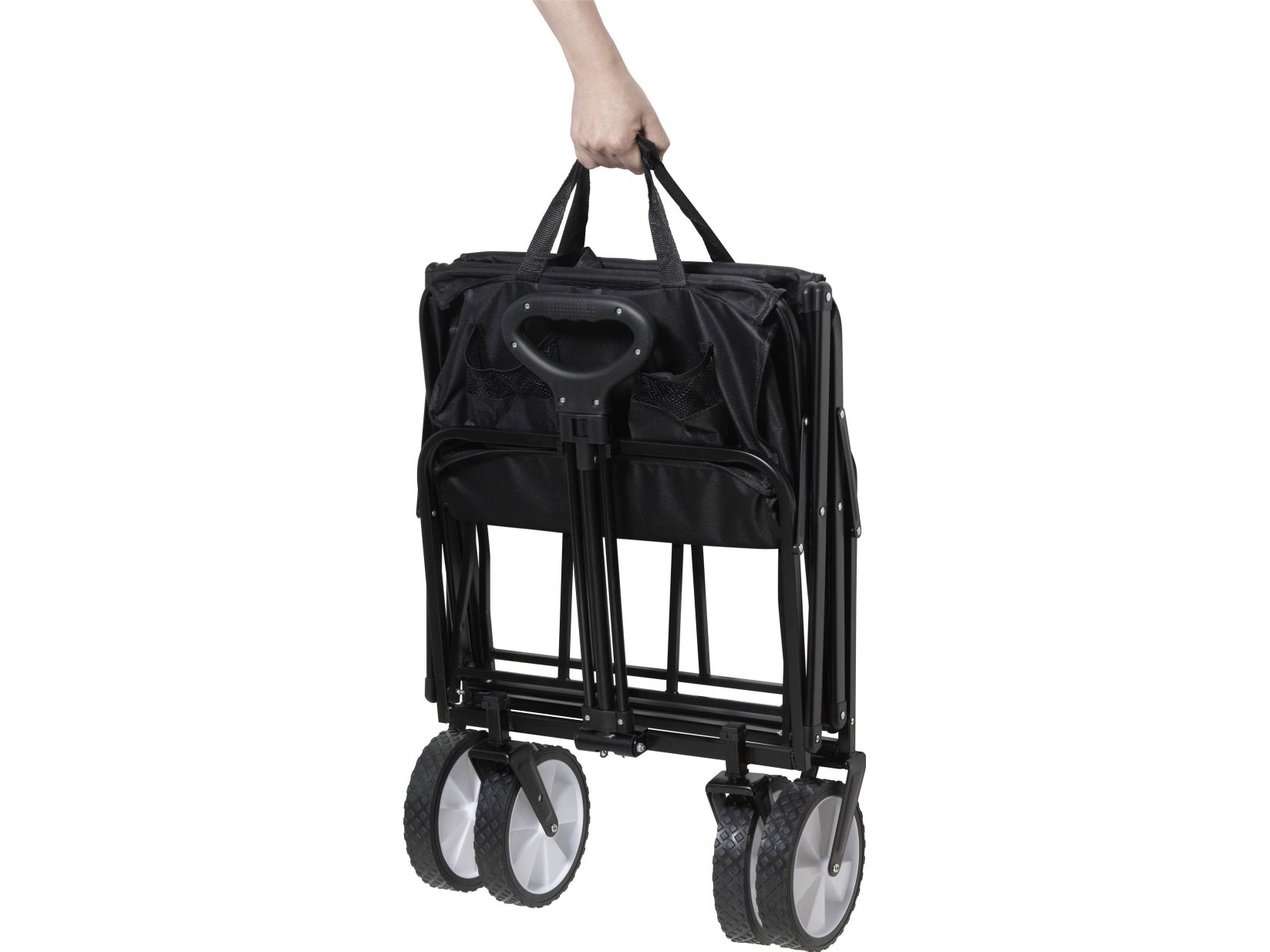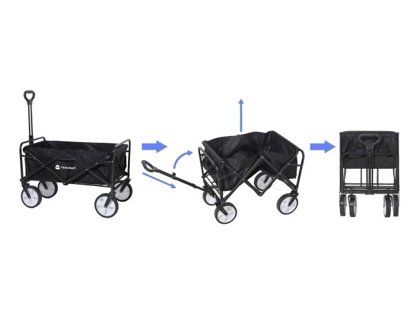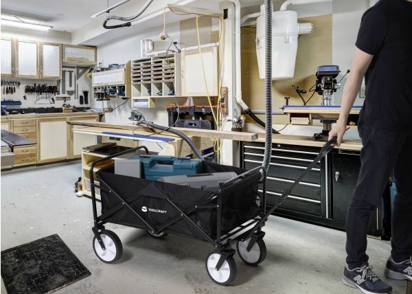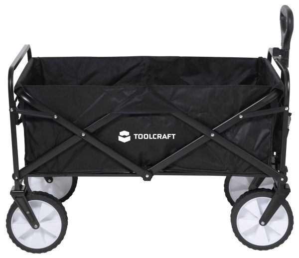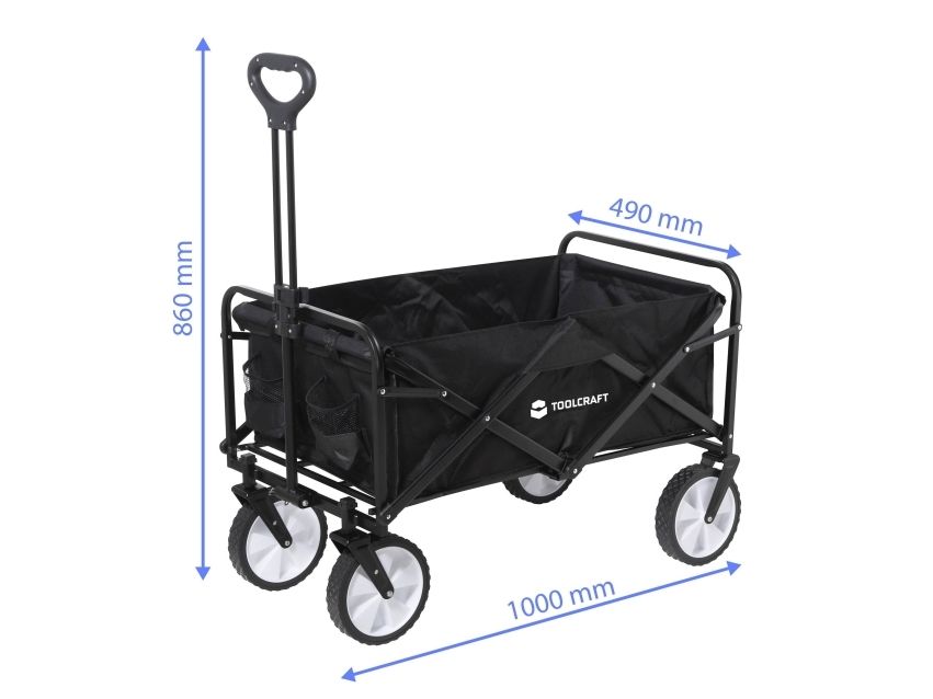TOOLCRAFT TRÆKVOGN KAN FOLDES SAMMEN 80 KG Holdbart materiale: Stålramme med hjul af PP + gummi Enkel betjening TOOLCRAFT bollervognen er lavet af holdbart materiale og er beregnet til en belastning på maks. 80 kg. Den har et stort ladevolumen, en justerbar trækstang og fleksible hjul og er desuden nem at opbevare og bevæge.