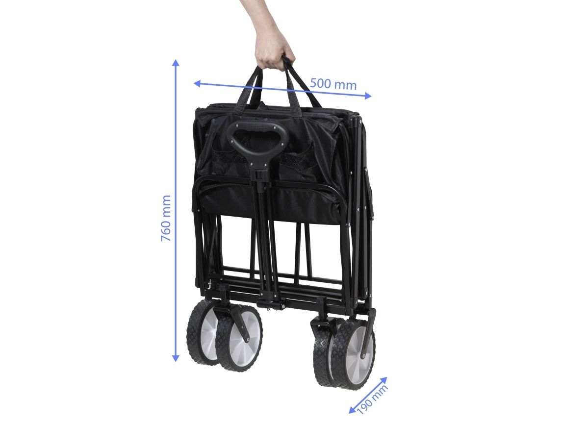 OBS! Denne produktbeskrivelse er endnu ikke blevet oversat til dansk af vores oversættere. Derfor er teksten maskineoversat fra den tyske originaltekst. Belastningsevne op til 80 kg Stor opladningsvolumen: 1000 x 490 x 860 mm Justerbar trækstang og fleksible hjul Let at opbevare og flytte