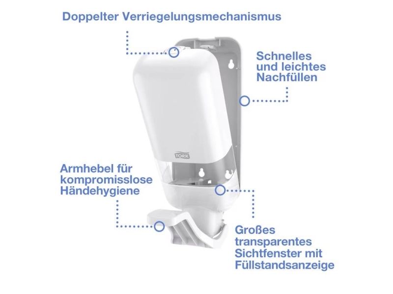 Tork dispenseren med arm til sæbe og hængedesinficerende midler er udviklet til anvendelse i områder, hvor god hygiejne er særligt vigtig. Den kan anvendes med et bredt sortiment af Tork sæbe, desinfektionsmidler og lotioner i hygiejnisk forseglede flasker, så den kan opfylde de særlige krav, som din forretning stiller. Den effektive dosering, den variable sæbemængde og Easy to use-certificeringen fremmer en god hygiejne for alle brugere*inden. Imponer dine gæster med det funktionelle og elegante design af vores mest alsidige dispenser til sæbe- og hængedesinficerende midler.