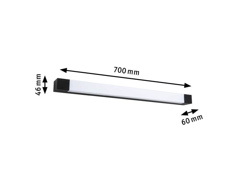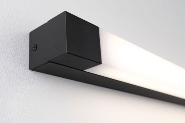 Selection bathroom LED spejllampe Quasar IP44 3000lm 230V 11,2W sort Effektiv LED-teknik Med satineret diffuser for ensartet lysfordeling Farvetemperatur: 3000K - varm hvid IP44-stænkvandsbeskyttet for fugtige rum Med integreret LED-pære Quasar-væglampen i sort er en designklassiske enhed, der med sin lineære og kantede form passer til mange moderne indretninger. Den satinerede diffuser sørger for en blændfri og ensartet belysning af spejlområdet. Med IP44-stænkvandsbeskyttet er den velegnet til brug på badeværelset eller vådrum. Den fastbyggede LED-lyskilde medfølger.