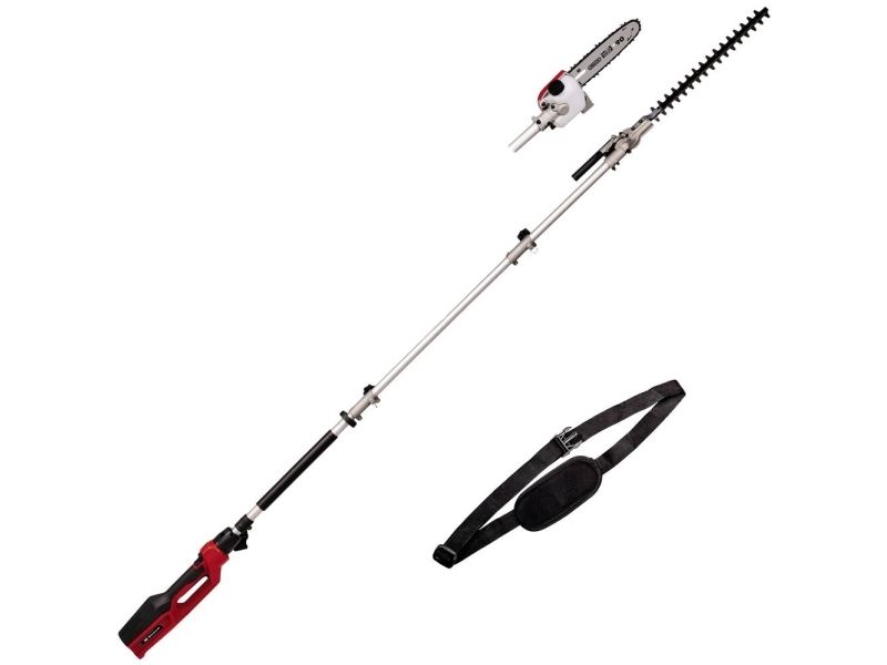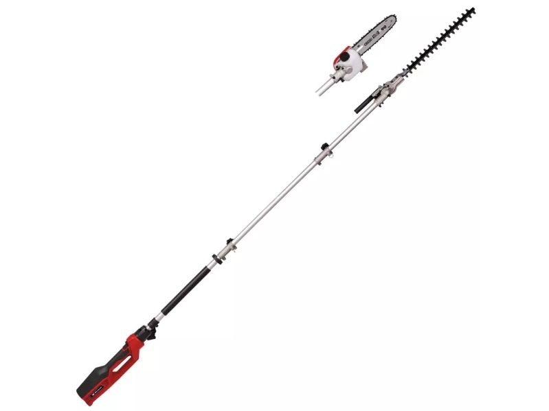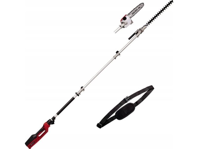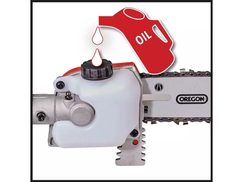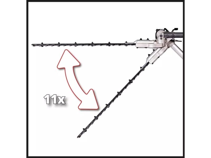 Elektrisk stavhækkeklipper / -sav GC-HC 90/2046 T. Vippebar skæretilbehør for optimale skæreresultaterKniv i laserskåret og diamantslebet stålStor tandafstand til skæring af tykke greneOregon kvalitetsklingeHøj kædehastighed til kraftfulde snit Den 900 watt stærke elektriske stav-hækkeklipper/-sav GC-HC 90/2046 T er en praktisk 2-i-1-enhed til beskæring af høje hække og grene. Den er takket være begge skæretilbehør teleskop-hækkesaks og beskæresaks i ét. Ved hjælp af den 46 cm lange hækkeklipperens beskæres hække, buske og buske med en længde på 41,2 cm i en håndevending. Takket være den store tandafstand på 20 mm er også tykkere grene ikke noget problem med laserskårede og diamantslebne knive. Den 20 cm lange OREGON-kædesavsværdi skærer også tykkere grene med 18 cm skærelængde. Et kraftfuldt snit muliggør en høj kædehastighed på op til 11 m/s. Herved bliver kæden altid smøres med den automatiske kædesmøring og 100 ml oliebeholder. Teleskophækkesaksen/-saven er 1,97 m lang. Konstrueret som split-slip kan den medfølgende forlænger monteres til en samlet længde af enheden på 2,60 m, så højtliggende grene og kviste kan nås. For en lang levetid er den elektriske teleskop-hækkesaks eller beskæresaksen udstyret med en robust metalgearkasse. For at arbejde optimalt fra forskellige vinkler kan hækkeskæretilbehøret vippes 11 gange. Desuden kan det bageste håndtag drejes til lodrette og vandrette snit. Softgripfladerne og den justerbare bæresele med hurtig frigørelse sørger for en komfortabel håndtering. De to skærehoveder opbevares og transporteres sikkert i stabile kogekre, som medfølger i leveringen.