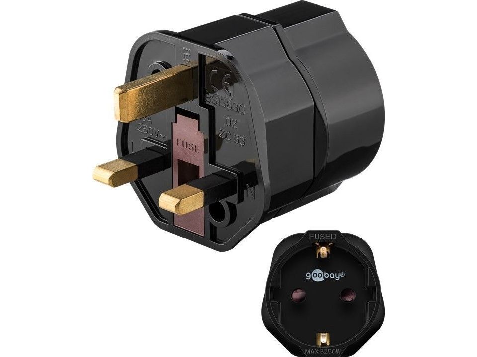 Praktisk, let rejsestik til at tilslutte elektriske apparater fra mange EU-lande til stikkontakter i Storbritannien