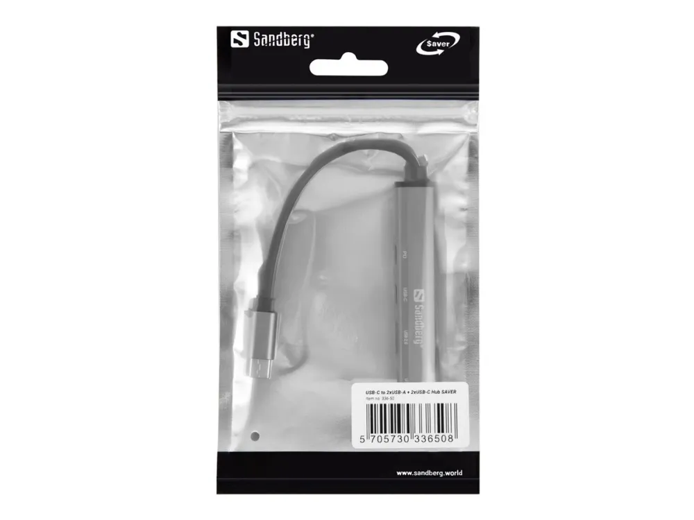 The Sandberg USB-C to 3 USB-A and 2 USB-C Hub Saver means lots of options for connecting extra USB-connected devices to your computer. You can have an external USB stick, printer and mouse connected simultaneously for example. The USB-C PD65W port lets you charge most USB-C powered laptops via the hub. Connect it to a USB-C port and it will work immediately, without the need to install drivers.