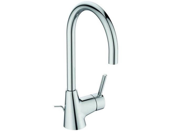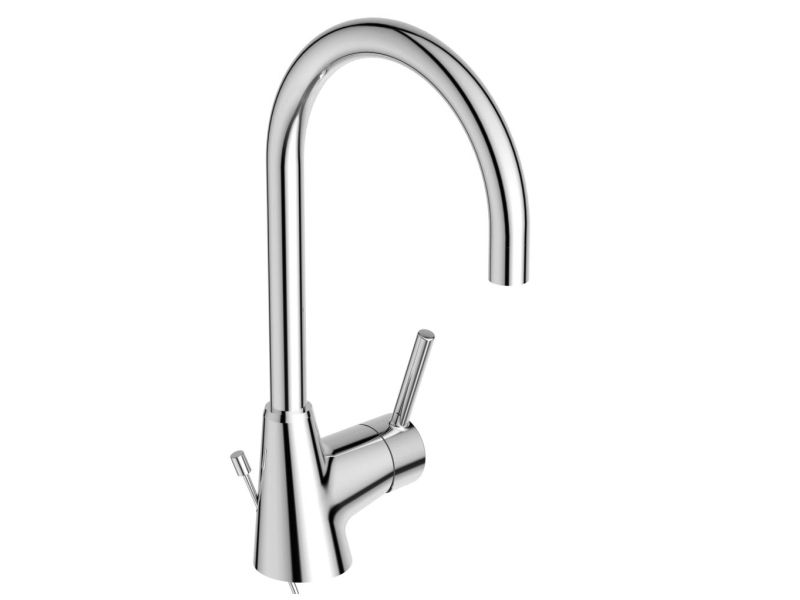 Ideal Standard Ceraline Håndvaskarmatur, krom, 1-grebs, keramisk kartouche, kan temperaturbegrænses, Svingbar C-tud m/18 mm spareluftblander 5 l/min., 160 mm tudfremspring, højde 208 mm, tilgange: flexslanger G3/8'', med træk-op bundventil