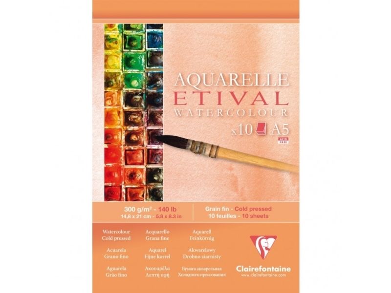 Clairefontaine Etival Akvarelblok A5,10 ark, 300gram, Cold Pressed, Toplimet med kraftigt kartonbagside