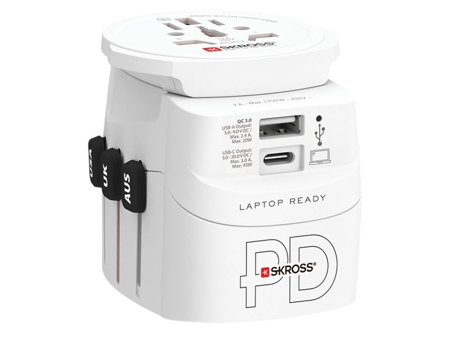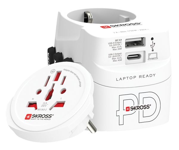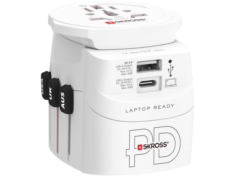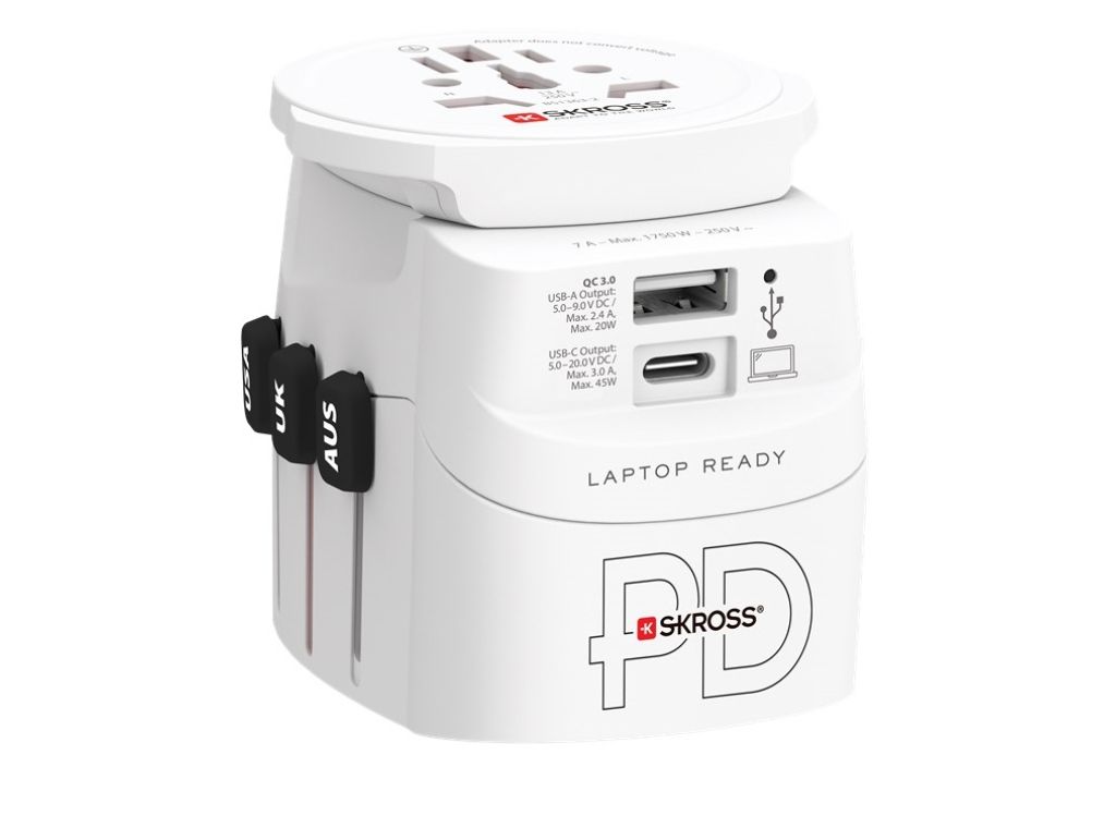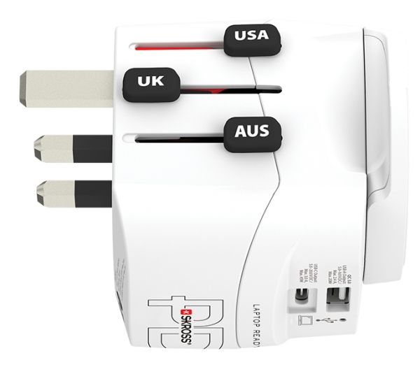 Dette rejsestik, World Adapter PRO Light USB AC30PD, fra SKROSS er en uundværlig gadget for den globale rejsende.