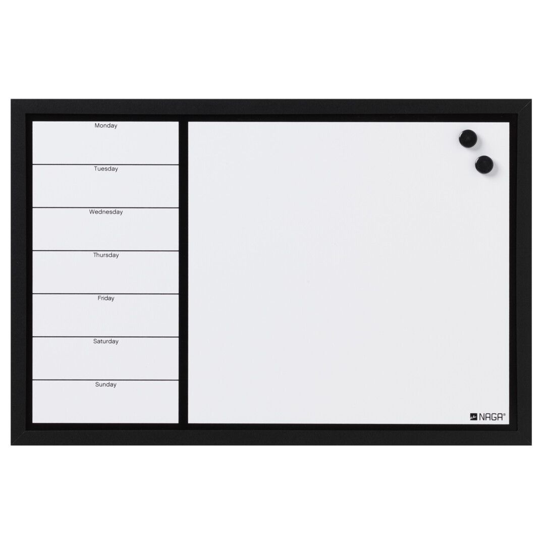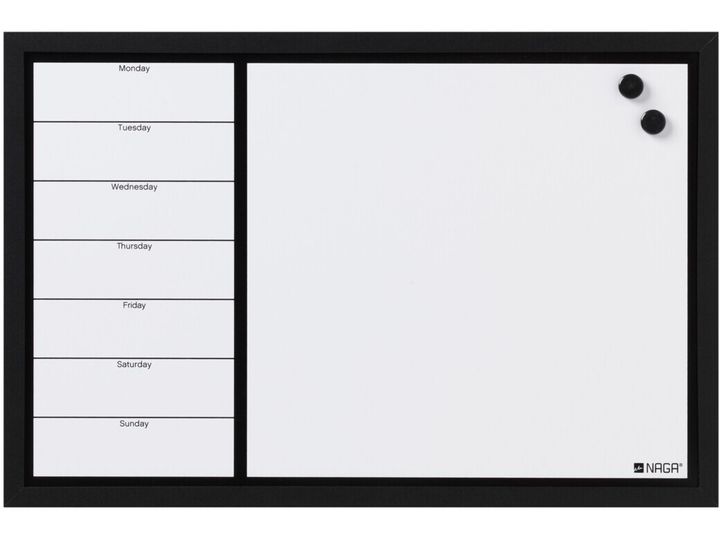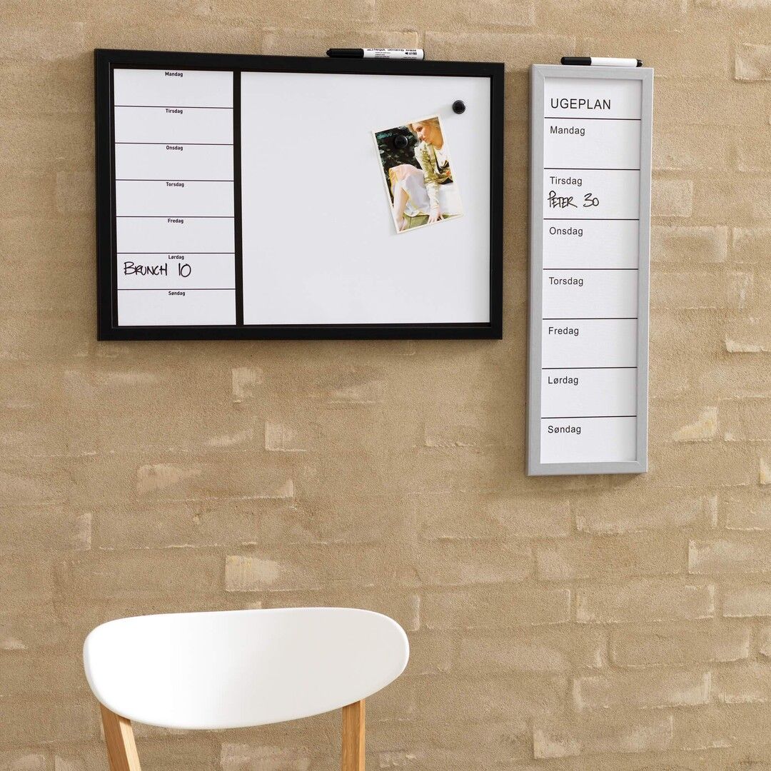 Magnetisk whiteboard ugetavle 60 x 40 cm. Engelsk.Hvid ugetavle med sort MDF ramme og engelsk tekst. Skriv på tavlen med en whiteboard marker, og sæt ting op på den med magneter. Ugetavlen gør det nemt at planlægge ugens aktiviteter for hele familien. Tavlen viskes ren med en almindelig tavlesvamp, evt. sammen med vores tavlerens. Vær opmærksom på, at tavlen ikke bør rengøres med husholdningssprit, da det vil fjerne den faste tekst på tavlen.Monteringskit medfølger. Dette indeholder to beslag og små skruer. Beslagene skal monteres på bagsiden af den sorte ramme – ikke direkte på selve tavlen. Når beslagene er monteret, kan ugetavlen hænges op på to skruer i væggen. Bemærk, at skruer til væggen ikke medfølger.Se alle ugetavler og uge planer.