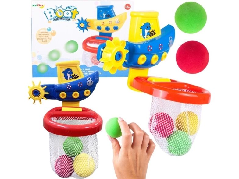 BÅT MED KURV OG BALLSETT BADELEKE SOM SITER TIL KURV