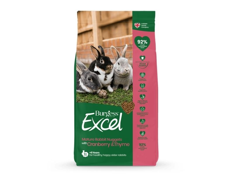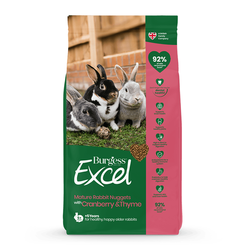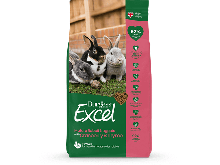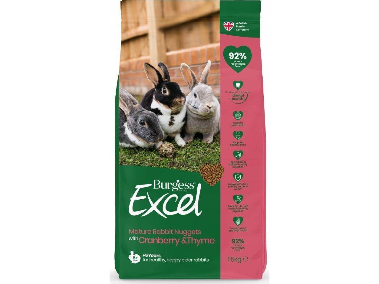 Burgess Excel Mature Rabbit Nuggets: Kaninpiller med tranebær og timian Burgess Excels lækre og fiberholdige kaninfoder med tranebær og timian supplerer din kanins kost med vitaminer, mineraler og forhindrer selektiv fodring. Velegnet til ældre kaniner på 5 år og derover.